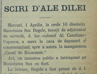 Pe 1 aprilie, 1881, Regele Carol I participă la deschiderea primului ghișeu al instituției, devenind primul depunător al unui libret de economii românesc.